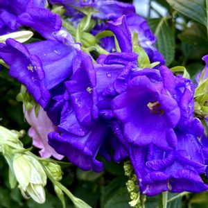 カンパニュラ2色、昨日の雨で花が沢山咲き過ぎていたので折れそうでした🤗 大きな鉢に4本植えたのですが、絡まっています🌿💜🌿🩷🌿