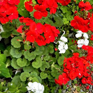 裏庭に咲く紅白ゼラニウム、紅組の勝ちです🤗 サーモンピンクも咲き始めました💕