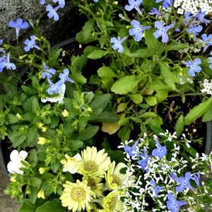 玄関前に夏用に涼しげな寄せ植えを作りました🤗 ガーベラ、アズーロ、ユーフォルビア、サフィニア等です🌿💙🤍🌿