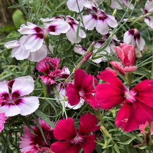 ダイアンサス、コロネット、ストロベリーとホワイトパープルアイ、 ダイアンサスダイアナ、クレムリンフレーム等が咲き始めました🤗 2年もので、花姿は乱れてます😅