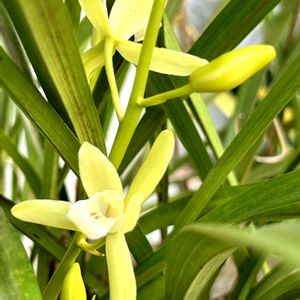 昨日の地震に被災された皆さまにお見舞いを申し上げます🙏 20年以上咲かなかったシンピジュウム「若草」に蕾が膨らんでいるのにビックリしました🤗 早速玄関前に置いたらボチボチ咲き始めました😉 葉っぱも細く、花もとても小さくて原種のような姿です🌿💕🌿