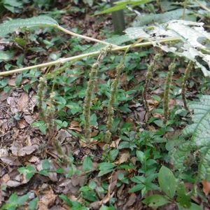 藪苧麻 イラクサ科 ヤブマオ属 多年草 分布 北海道〜九州 花期 8〜10月 雌雄同株で葉の脇から穂状花序を出し茎の上方では雌花序を下方では雄花序を出すが雄花序を付けない個体も多く見られる。 --実際ここでは雄花序をつけた個体は見られなかった--