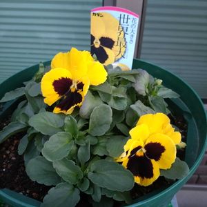 おはようございます☀ カダン ボニータ🎵 今朝の様子です。 買った時の苗が小さかったのか、やっとお花が咲いてきました〜😆 今年のパンビオは再生土使ってるから成長遅いのかもしれません😅 早速 花径を計ってみたら6cm‼️ まだまだ普通のパンジーサイズです。