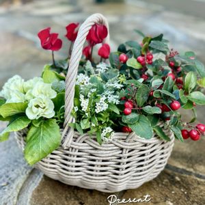♡花かご🧺♡No.3 お友達の誕生日プレゼント🎁🧺𓂃܀❀ .*゚ クリスマスも近いので真っ赤なチェッカーベリーとガーデンシクラメンをメインに白花を添えてみました ❶〜❹花かごをいろいろな角度からご覧下さいネ🙇♀️ ❺アンナガーデン 聖アンナ教会⛪️(福島市) 福島市西部 吾妻連峰の山麓に位置する観光スポット 聖アンナ教会を中心に個性豊かな逸品を扱うショップが揃っています。 花かご🧺🎁をお友達に渡し久しぶりにゆっくりランチ🍝外に出ると〜 午前まで降っていた雪も止み雲☁️の隙間から冬の澄み切った青空が清々しくとても綺麗でした📸