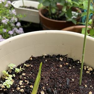 本日2投目 花友さんにいただいた グロリオサの芽が出てきました🌱 わかりやすいように支柱たてたのに 反対から出てきた…🥹 …しかも斜めってる🤣