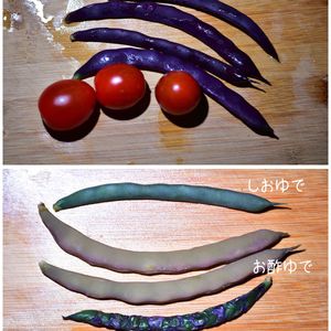 ムラサキインゲン トリオンフォバイオレット。ゆでるときれいな紫から紫と緑の混ざった汚い色になります。 さやいんげんなので、通常は塩ゆででいただきますが、実験で、お酢でゆでた物、レンちんした物を用意しました。アントシアニンは酸性で安定だからです( ー`дー´)キリッ. お酢ゆでは塩ゆでよりも色が抜けました💦 600w 1分のレンチンは、紫と緑のまだらになりました˚‧º·(˚ ˃̣̣̥⌓˂̣̣̥ )‧º·˚ きれいな紫を残せる加熱方法を見つければ、イグノーベル賞はいただきっ🎵