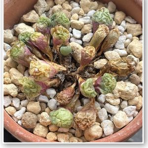 こんにちは🍀*゜ 夏を迎える前のリトープスの姿❣️ 1、2枚目 無事に脱皮が済んだ子達 3枚目 脱皮途中の子達 4枚目 脱皮済み、脱皮途中、ヘンテコな子達 左上の子は大丈夫かな...🤔 5枚目 脱皮途中、干からびた子達 真ん中の子は以前投稿した双子ちゃんです。やっぱりダメでした(。•́•̀。)💦