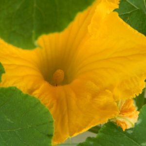 カボチャの雄花です.葉の下に咲いています.食べ播きしたものが大きく育って,グリーンカーテンもどきになっています.毎年,ゴーヤでグリーンカーテンを作っているのですが,今年はこのカボチャで代用します.受粉した雌花も一つあって,実の写真も撮れそうです. 撮影 Jul. 13, 2023