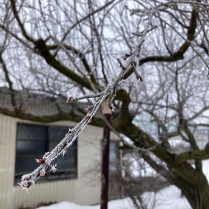 今朝は霧がかかって霜が降りています。 今pic、近所の梅の木さんです。 糸がかかっているような、結晶?霜もついていて綺麗でした❄︎