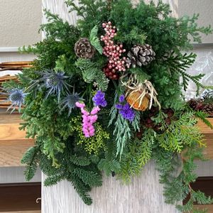 午前中、壁掛けクリスマス飾りを作りました 半分のオアシスに刺し、正月用にもなります