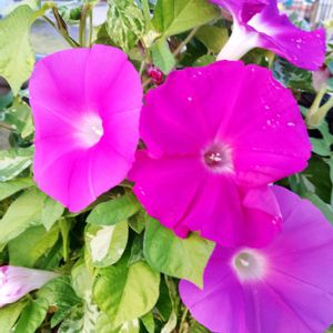 朝散歩の歩道の柵に 咲いているアサガオ とてもきれいです。 歩きに元気がもらえます。🧍🧍 🩷🩷🤍🤍💜💜