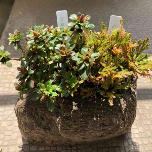 手彫りの軽石鉢に、寄せ植えをしてもらいました。 左がミヤマキリシマ、右がイワヒバです。 イワヒバの根元にイワチドリの球根を植えてあり、3つとも発芽しています。 あと1〜2ヶ月で開花予定です。 ミヤマキリシマは蕾も元気です。 ハイポネックスが届いたらあげてみようと思います。