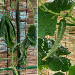 もひとつ、きゅうり🥒♬ 右の株はまだ元気だけど、左の株が、3日ほど前から突然萎れ始めました😱 下の方にある子ヅルまではまだ元気っぽいから、そこから上を切り落として様子見😥 水は2本とも同じようにあげてるしなぁ🤔 病気なのか、虫の仕業なのか、苗が弱かったのか.....💦 急にくるからビックリ😓