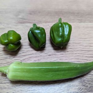 ちっともピーマン大きくならなかったし、まだまだ花が沢山咲いてるので、小さいの収穫✨ 甘苦で、なんか美味しい! オクラ、花を見ないうちになってた…😅
