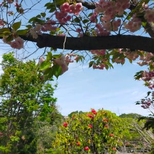 華やかな春の色合い 春っていいですね〜♪ 赤のシャクナゲと サクラ(フゲンゾウ)1⃣ 水色の空に素敵な花模様2⃣