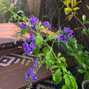 デュランタ宝塚 濃い紫色に白いふちどり 緑の葉が夏の暑さ乗り越えて いい感じです!