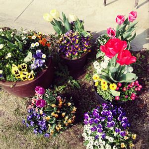 チューリップ🌷とノースポールとパンジー.ビオラこんもり🌻🌼🌷鉢からあふれております🐤
