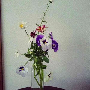 伸びきって垂れ下がったビオラとノースポールを母監修の元生けました🌼🌷花はいろんな表情を見せてくれます🌻🌼