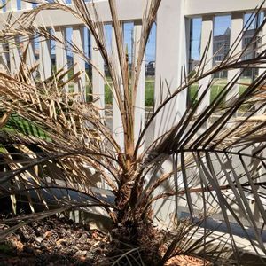 ナツメヤシ🌴 越冬後の状態です。 マイナス一度迄しか下がつていないのに結構傷みました。 所で左右の鉢で年数が結構違うのですが何故か同じ大きさ(汗💦