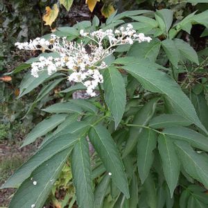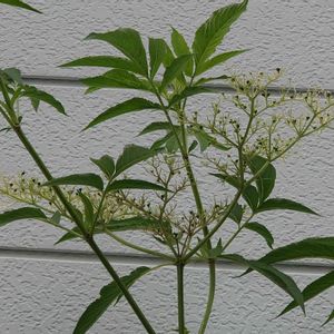 【蒴藋】《スイカズラ科》 花言葉 「熱心」 別名 クサニワトコ 地下茎を出して増え広がります。 茎の基部が木質化します。 葉は対生する奇数羽状複葉で、 5~7枚の小葉からなります。 小葉の大きさは長さ5~17cm、 幅2~6cmの楕円形~披針形で、 縁には細かい鋸歯があります。 枝先に大きな散房状集散花序を出し、 小さな花を多数つけます。 花は径3~4mmで、 花冠は深く5裂して白色です。 果実は径mmほどの球形の核果となり赤色に熟します。 〔来歴〕中国から薬用植物として渡来したものが野生化したという説があります。 〔利用〕全草を薬用とします。 花には蜜はなく、花序のところどころにある黄色の腺体に蜜をためる。 黄色い物は “蜜壷” 。 2022.8.6
