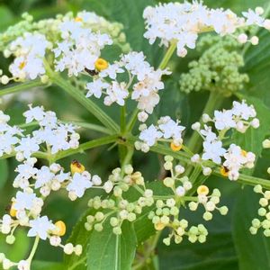 雨の中~‘’花友さんのご案内~🚗♫‘’ ソクズ(スイカズラ科) ニワトコ属 林の中、湿った場所に広く群生していました。 静かな雨に濡れる林、 鳥たちの鳴き声も心地よく、圧巻のお花畑です🤍💛🤍🎶 花には蜜がなく、花の中にまばらにある黄色いドーナツの様な腺体に蜜をためて~虫を誘っているそう(^^)v 🐞🐜さんが~動き回って、受粉のお手伝いをしていました💛