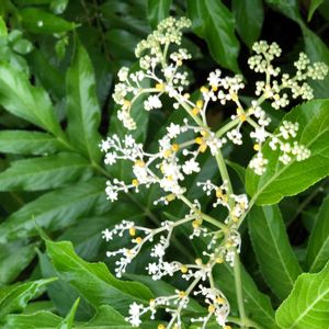 【ソクズ】 スイカズラ科 ニワトコ属 私の住んでるマンションの下でソクズが群落を形成してます。草丈1.5m程でワサワサとジャングル状態… フェンスで囲まれており立ち入り不可ですが別の場所で発見した為それを投稿します。 花に蜜はなく代わりにオレンジ色の花外蜜腺(カガイミツセン)である腺体(センタイ)があるちょっと変わった花のようです。 写真では花があまり咲いてないのが残念です。 昔は薬草としても活躍したそうですが現在では使われてないようです 🤔
