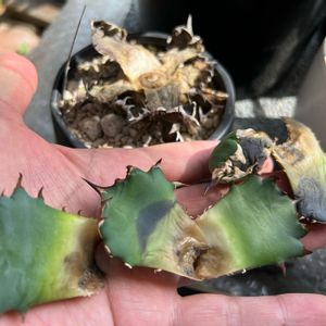 とんでもなくショックなことが発生❗️❗️ 昨日ご機嫌にpicをアップした厳竜さん、炭疽病の疑いがあることが昨晩発覚。 日光浴から室内へ戻した際、葉の付け根の黒いシミを発見。覗き込むと、葉と葉の接触箇所に真っ黒な1cm大のシミが・・・😱😱😱 なんだこれ!! とネット検索すると、炭疽病ってのに近いと思われます。この病、注釈で、チタノタの斑入りに多く発生するとのこと。しこたま合致!アガベでよく起こり、遺伝の可能性もあるとか。他の株へ伝染するので、その株は廃棄がよろしいとか。 マジで〜😱😱😱 あのー、これ先週ポチって土曜に届いたばかりなんですけどー😓その翌日に病気持ち発覚って、どーいうこと!? とりあえず緊急点検で引っこ抜くと、根には異常無し。たぶん。 葉をミシミシと押し込んで葉の隙間から奥を覗くと、黒点は途中までで成長点までは達していないことが判明。 ここだけ爪が折れて白くなっているの、何らかのサインだったというのか!? 一先ず昨晩は慌ててベンレート液作ってぶっかけ殺菌。15℃以上でカビ菌が活性化するとのことなので、室内からベランダの隅へ移動させ隔離。寒さに弱いチタノタにはスパルタですよ。 オペを断行すべきか思案中です。 オペをすると、かなり悲しい姿になりそう。 オペすべきでしょうか? HELPです😥誰か助けて〜