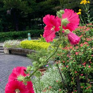 連投失礼いたします🙏 【今日のお花】② 先日、漫湖公園内を歩きましたが、 5/14に投稿させていただいた (4/12撮影)高さ3メートル以上は あると思われた立葵の姿が消えて いましたー😭 ですが、その立葵があった 向かい辺りに、また、別の 立葵が咲いていました😊 2022.05.24 那覇市 漫湖公園
