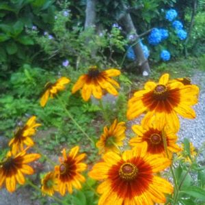 季節は夏へ💛 オオハンゴンソウ(大反魂草)が咲き始めました🧡🧡🧡 遠くで紫陽花💙が別れを告げている…… と思いきや、紫陽花の蕾がまだいっぱいありました😅😅😅🤣