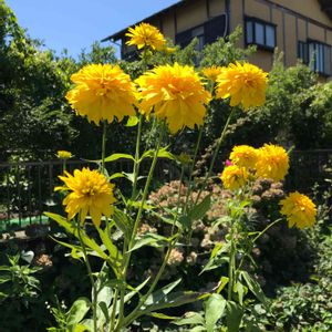 今朝の散歩は6,800歩。八重咲きの #オオハンゴウソウ #大反魂草 が2m以上に育ってゴミ捨て場の横で咲いていた。北米原産で日本全国で野生化している。反魂は魂を呼び戻すという意味で、手のひら状に裂ける葉を幽霊の手に見立てた。幼少時は線路脇でよく見かけた花。これも私にとって夏休みの花だな~。