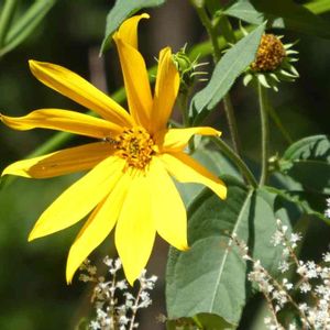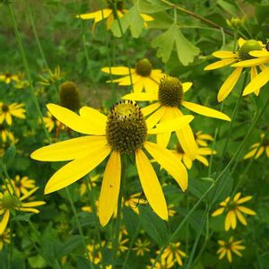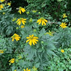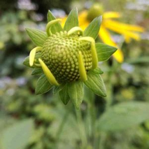 私は特定外来生物Ψ( Φ∀Φ)Ψ 駆除なんかされてやらない (ฅ`Д´ฅ)シャー と言ってるようなオオハンゴンソウ(咲き始め) 後ろに咲いているお花が写ってます🌸