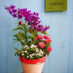 #本日の寄せ植え。 #ガーデニング蘭 #ジニアプロフュージョン #日々草夏花火 #千日紅ストロベリーフィールド 。 。 秋まで咲く花たちで寄せ植え! 。 ガーデニング蘭 のうねりがまた芸術的✨。 玄関先で蘭を楽しめる贅沢な 寄せ植えです☺️