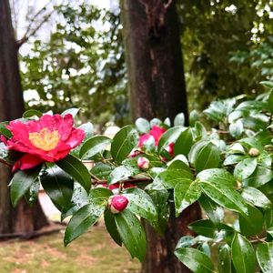 カンツバキ(寒椿) 冬に咲くツバキ科の常緑低木 ツバキとサザンカの交配種と言われるが異論もあるそうです🤔 八重咲きで花びらは一枚ずつ散り これが花が丸ごと落ちるツバキとは異なる点です 別名「獅子頭(ししがしら)」 個人的には寒椿の方が絶対良いと思います🤭