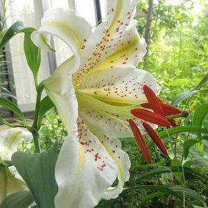 ヤマユリ⚜️ 洗面所の窓から… こんにちは~と顔を出しています🎵 強くしなやかに… かなり前屈しております⤵️ 昨年8/9に同じ様子を投稿してますので、今年はかなり早い開花です❣️ 近所の庭先や道端にもヤマユリの姿をたくさん見かけ嬉しくなります🤗