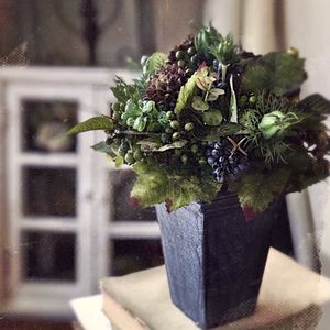 ベーシックコースの課題、シックアレンジ。生徒様の作品です。 いつも選んでしまう好みの色合いではなく、敢えてシックな花材で挑戦です。 でも、とても素敵にできました!