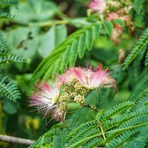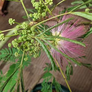 こんばんは〜 ネムノキの花が咲いています🌸💚 朝水やりしたのに夕方すごく乾いていて水やりしていて見つけました😊🎶💗 これからしばらく楽しめそうですƪ(˘⌣˘)ʃ❣️✨