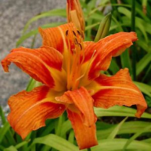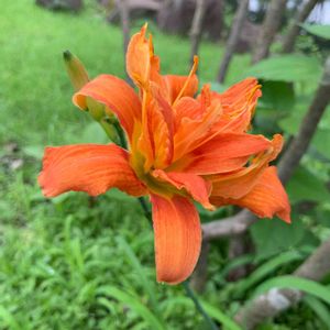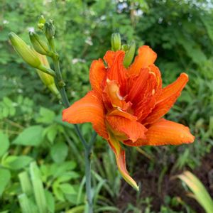 もの凄い雨降りになってました。庭の片隅にいつも出てくるオレンジのお花。 お名前も知らずにいたけれど、☔️に打たれても健気に咲く姿に心を奪われて、傘をさし☂️スマホでパチリ📱 お名前は ヤブカンゾウ(藪萱草)のようです。一重に見えるけど八重咲きです。
