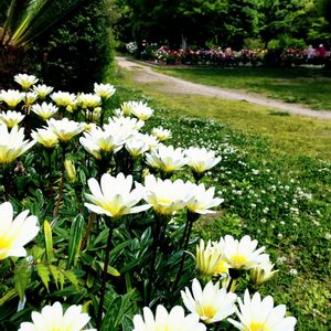 尼崎市上坂部西公園 ガザニアが咲いています。 蘇鉄の向こうにバラも見えます。 樹木の緑が深くなってきました。