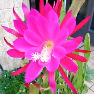 おはようございます🍀 クジャクサボテン🌵❤️ 今回は蕾の赤さからピンクではなく「赤花」の開花です♡ 🍀花友さんから節を貰ってから4年(?)🤍🩷🩷❤️💮🌵と各鉢咲きました🙌🙌😄 昨夜の蕾の膨らみ、🌃咲くぞ…💡と玄関内に取り込み…でも 先に私がギブ😪⤵️ 今朝は、💮🌵伸び伸びと〜〜🎶 まだ蕾2つを従えてます( ◜‿◝ )♡