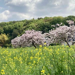 散歩先にて。 菜の花と桜と山と・・・曇天☁️😓 晴れた日ならもっと映えたでしょうね😌