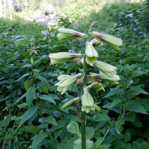 No.1166 オオウバユリ(大姥百合) ユリ科ユリ属 その3 オオウバユリはでかいです☺️ 150センチを超えてます☺️ 花も15個くらい付けてます🎵 花の大きさは12、3センチくらい☺️ 花の咲く頃に下の葉がないことから、「姥百合」の名があるのですが、これからもわかるように、実際は開花時にも立派な葉があります😥 オオウバユリはその2(No.1113:2021.06.06)にも書いたけど、開花するのは一生に一度だけ🙄 この花の果実が、次に花を付けるのはうまくいけば、約10年後です🎵
