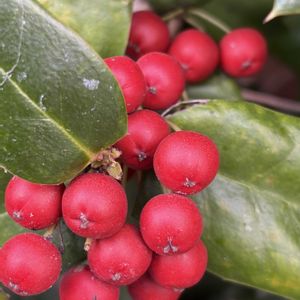 今日の早朝ウォーキングで ①クリスマスホーリー ②クラリンドウ ③ダイヤモンドリリー ④イチョウ ⑤朝焼けとススキ