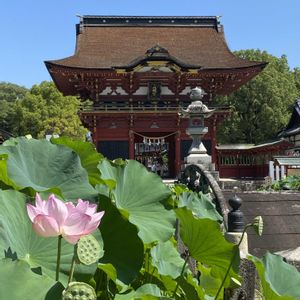 蓮の花🪷✨ 徳川家康が戦勝祈願を行っていたという由緒ある伊賀八幡宮に行きました。朱色の社と敷地内にある蓮池のコントラストが素敵でした。