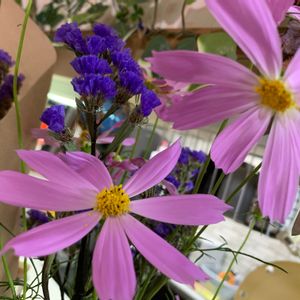 こんにちは 今日お出掛けをして一ヶ所のお花屋さんへ行きいくつかお花を買い また通り道でお花を売っていたから つい買ってしまいました 何故かお花屋さん巡りのようになってしまいました 2軒目のお花屋さんでまた花束を買いました スターチスは可愛いですね 向日葵は大好きです 濃いパープルグラジオラスが咲き始めました