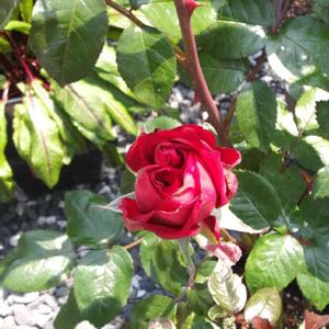 おはようございます☁️ 雨はまだ降っていませんが、今日は雨の予報です☔ イングリッドバーグマン🌹 これぞバラ✨という真っ赤な大輪✨ 春はひとつしか咲かなかったけど、いま大きな蕾が赤くなってきました😍💕この子は夏剪定できませんでしたっ😆🌱