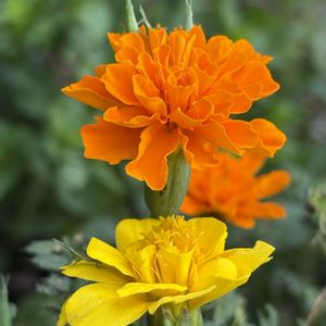 《マリーゴールド その1》 朝陽を浴びて、花びらの布団から次々と目覚め出したバッタたち🌞 今日も生き延びてよ〜☺️💕💕✨✨✨ 2025.7.12🤳