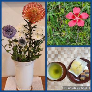 ストアーのお花売場で青紫のボンボン玉の花に目が留まり、さっそく一緒に購入した花と花瓶に活けました✨️ ⬅️ ❇️エキノプス 真っ直ぐに伸びた茎の上に、丸いボール状の花を咲かせる。その花色が深い紫がかった青であることから、ルリ(瑠璃)タマアザミという名前がついている。 ❇️ピンクッション ❇️コギク(白) ↗️ ❇️モミジアオイ 散歩で出合った花です。我が家はまだ咲いていません。 りんさんの 🏷️和菓子の日 に初めて参加します🙋♀️ 本来は「和菓子に見えるお花」の意なのかな?🤔 和菓子🍡そのもののpicです😅 ↘️ ✴️かすたどん、芋しゃり羊羮、緑茶 お茶タイム🍵 お菓子は、蒸気屋のです。かすたどんは、孫たちは夏には、冷凍して食べてますね😋 芋しゃり羊羮は、佐賀の小城羊羹に似た形状で、3色のさつま芋でできたお菓子。1袋小さな羊羮9本入り。 かなり甘いので、1本を4等分して、1口サイズにすると見た目が綺麗です✨️