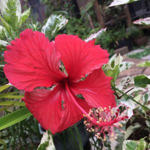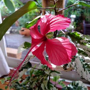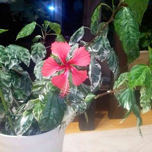 斑入りハイビスカス🌺 奥の赤い葉は 冬越しした去年からいるフラムルージュ 手前は 1ヶ月くらい前にお迎えしたスノーフレーク この色の違いは何かなぁ〜〜? お日様にあたってないから? それとも品種の違い? どちらも好きだけど(o´艸`)♥️