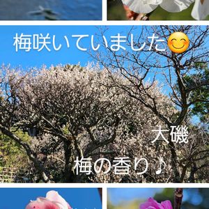 1月公園散歩にて‥ 梅‥咲いていました😊 5枚集めました… ①~④梅♪ ⑤番外編‥大磯の海