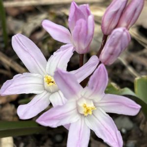 🌱庭のお花🌱 🌸チオノドクサ🌸 ヒヤシンス科チオノドクサ属 春遅い庭からも可愛いお顔が💓 1️⃣2️⃣3️⃣3種のお色です🩷💜🤍 寒冷地好きな高山植物🌱 🌸クロッカス🌸 アヤメ科クロッカス属 4️⃣真上から〜💜 5️⃣ズームイン❣️雌蕊と雄蕊🧡 花粉をいっぱい出して〜 ミツバチ🐝訪問してましたよっ💓